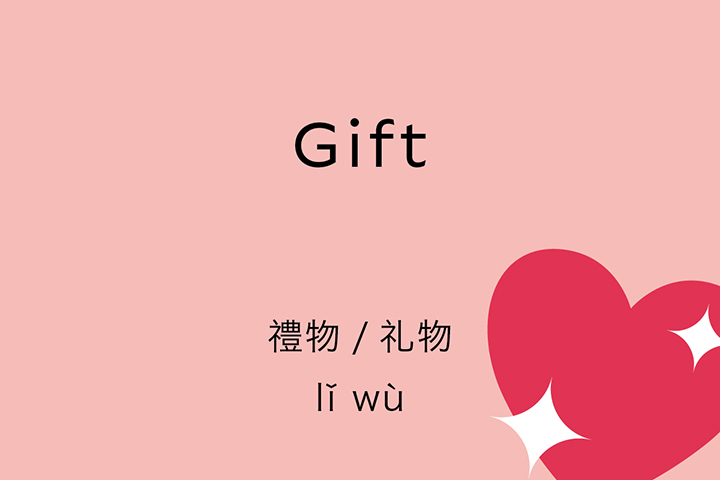 The way to say “gift” in Chinese is 禮物/礼物. The first character 禮/礼 means “good manners” and 物 means “physical object,” so the “object that is well mannered” is a “gift”, 禮物/礼物. To give a gift you say “送禮物/送礼物” and to receive a gift you say “收禮物/收礼物.”