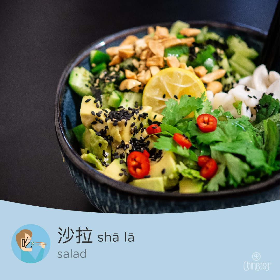 Image displaying the Chinese characters 沙拉 (shālā) meaning ‘salad’, with pinyin pronunciation. The characters are clearly shown, accompanied by the romanized pinyin ‘shālā’ to assist with pronunciation.