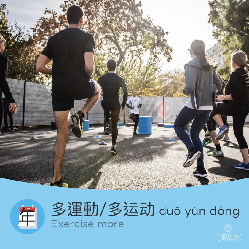 The Chinese phrase for “exercise more” is 多運動/多运动, pronounced “duō yùn dòng.”