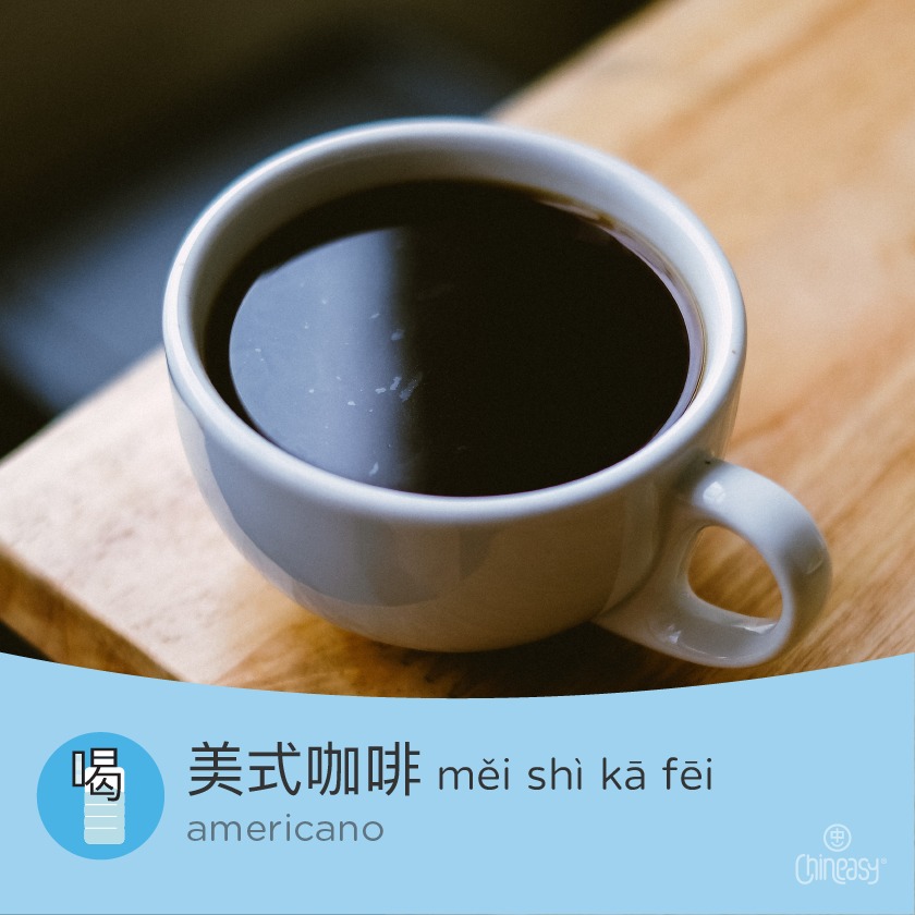 The Americano is called 美式咖啡 (měi shì kā fēi) in Chinese. 美式 means “American style,” so 美式咖啡 translates to “American style coffee.”