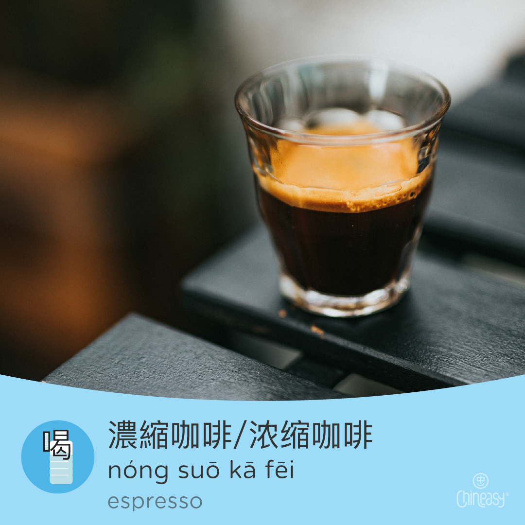 For strong coffee lovers, we have espresso, known as 濃縮咖啡/浓缩咖啡 (nóng suō kā fēi) in Chinese.