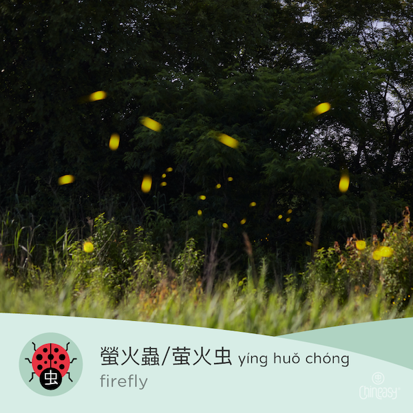 In English, this insect has many names attached to it, including firefly, firebug or lightning bug. Nevertheless, when it comes to Chinese, we just call it 螢火蟲/萤火虫 (yíng huǒ chóng), literally, glow-worm fire insect. Interestingly, fireflies were once kept as pets and used for imperial entertainment in ancient China; nowadays, they are regarded as a romantic symbol in modern China.