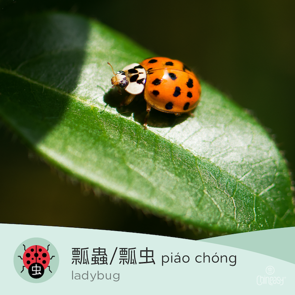 瓢蟲/瓢虫 (piáo chóng) is the Chinese name for “ladybug.” 瓢 means “ladle,” and 蟲/虫 is “insect” or “bug.” So why does ladle plus insect mean “ladybug?” . The ladybug has a domed-shaped body, and when you turn it upside down, it resembles the shape of the bowl in a cooking ladle. Did you get it?