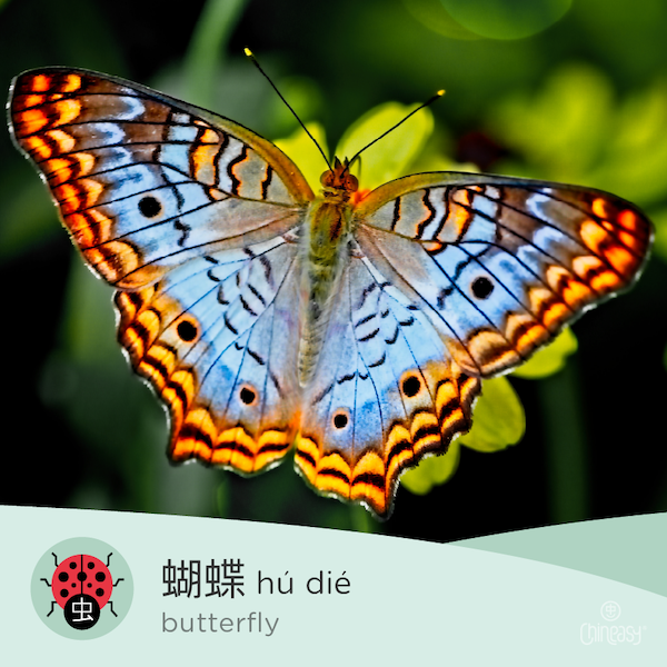 Lastly, we can’t end this post without talking about the most beautiful flying butterfly! The Chinese word for butterfly is 蝴蝶 (hú dié). Can you spot the insect radical 虫 in both characters?