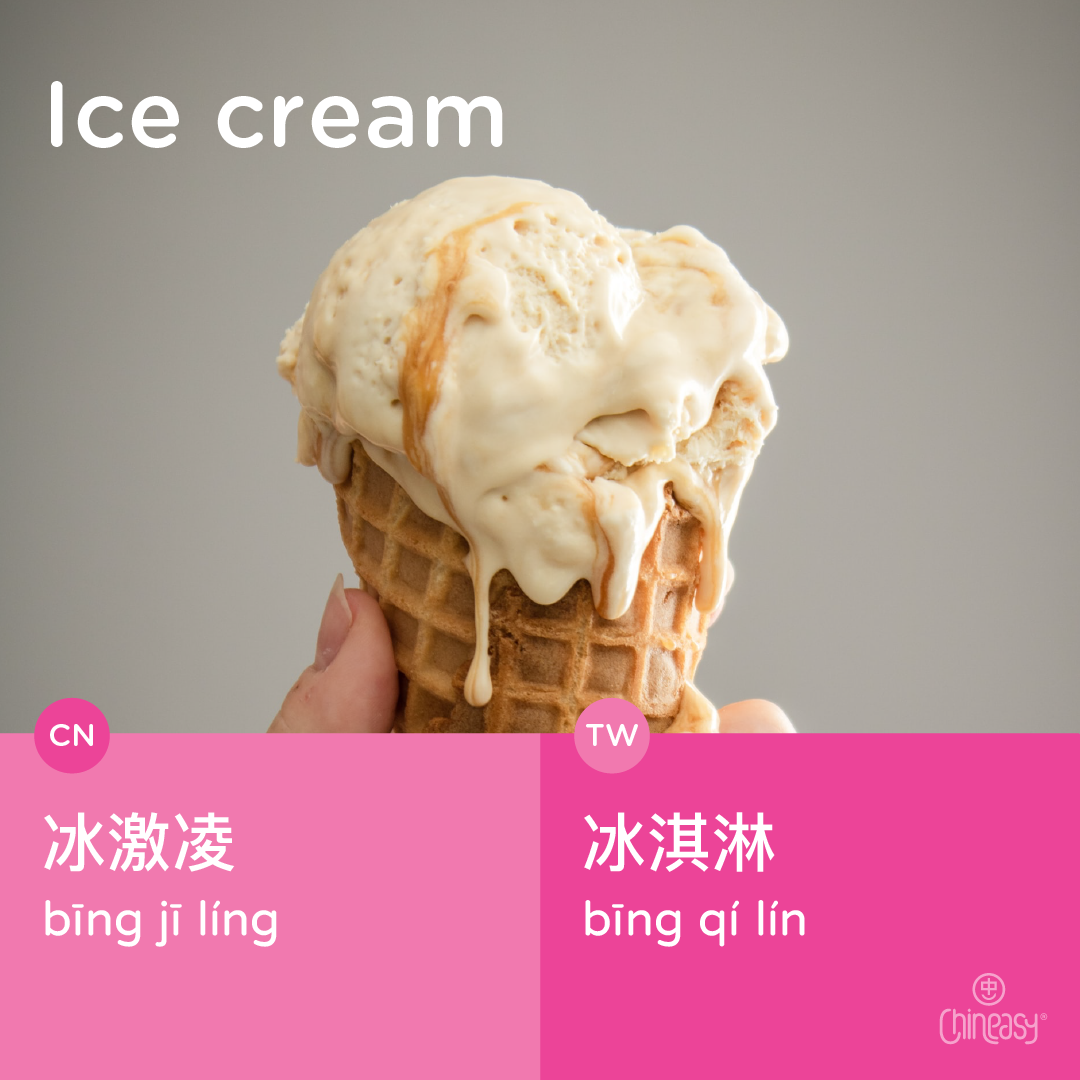 Ice cream: 冰激凌 in China vs 冰淇淋 in Taiwan