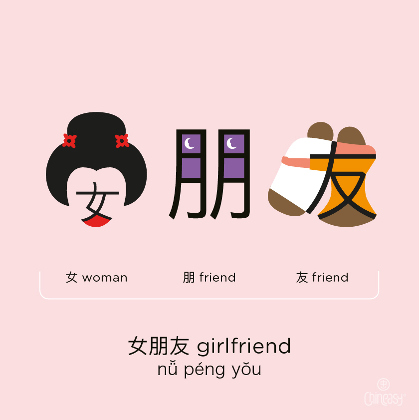 女 (Woman/Female) + 朋友 (Friend ) = Girlfriend (女朋友)