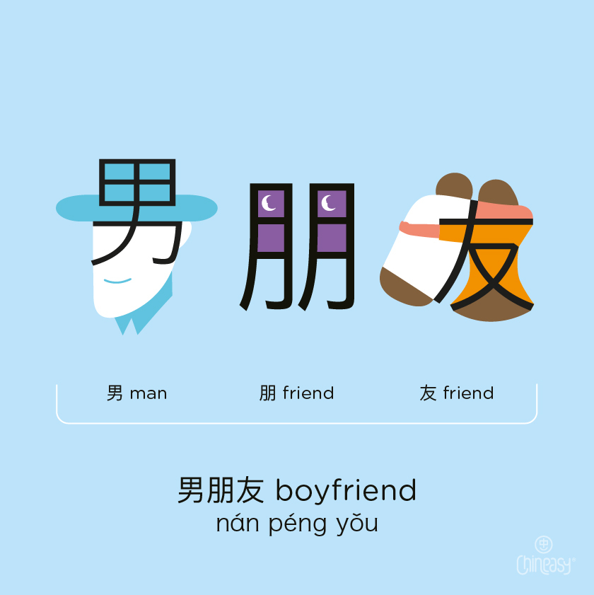 男 (Man/Male) + 朋友 (Friend ) = Boyfriend (男朋友)