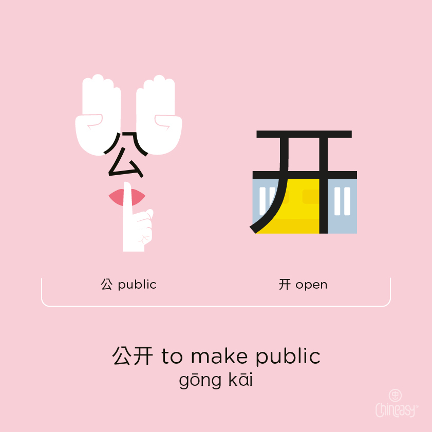公 (Public) + 开 (Open) = To make public/open up (about something) (公开)