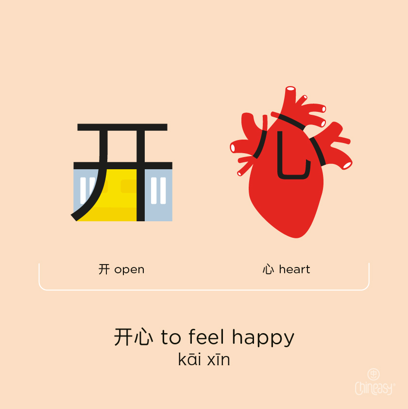 开 (Open) + 心 (heart) = To feel happy/joyful/to be delighted (开心)