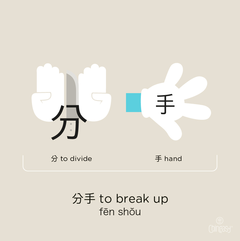 分 (To divide) + 手 (hand) = To break up/split up (分手)
