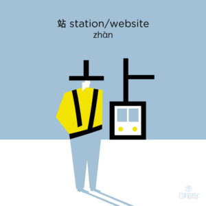 站 pinyin: zhàn; to stand up (as a verb); station, stand or website (as a noun)