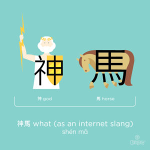 神馬/神马 pinyin: shén mǎ; Mythical horse; what (as an internet slang)