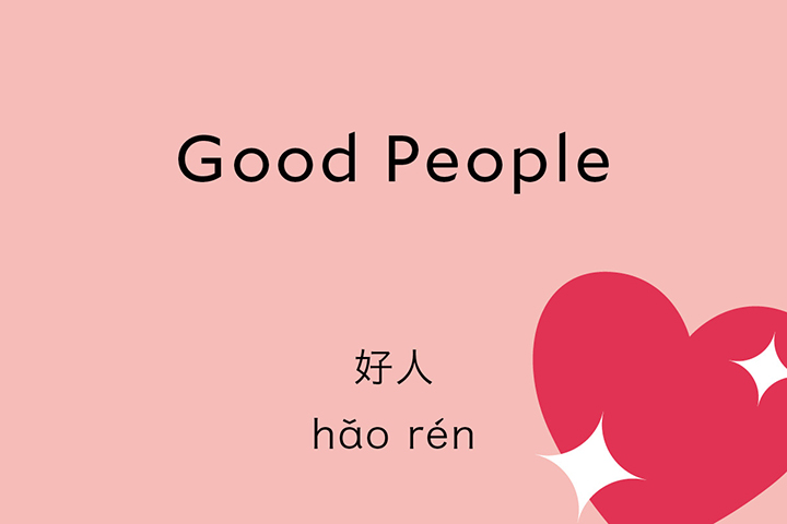 The way to say “good person” or “good people” in Chinese is 好人. The first character means “good” and is the same as the character in “hello” 你好, while the second character, 人, means person. So it’s quite a clear direct translation “good person” 好人.