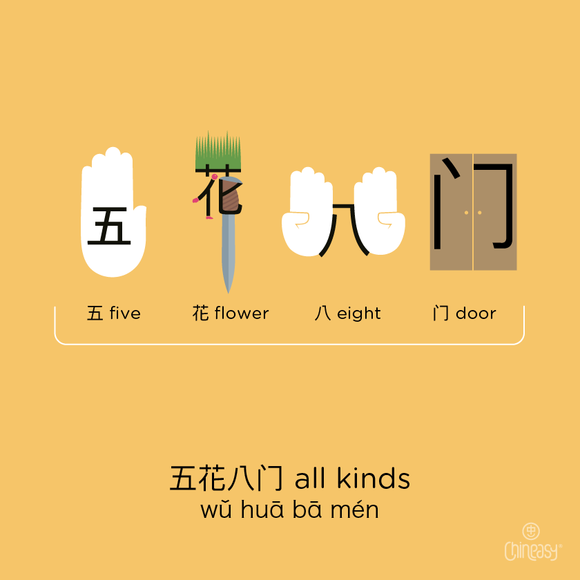 This idiom describes the wide variety or diversity of something. In ancient China, the terms “five flowers” (五花) and “eight doors” (八门), were used to refer to various trades. Nowadays, the idiom 五花八门 means “all kinds” of something.